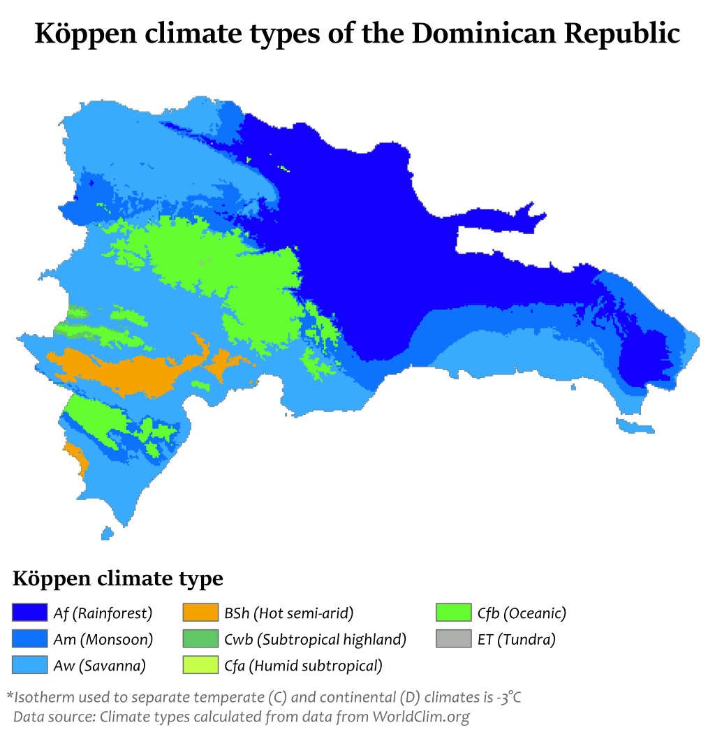 The Dominican Republic has a tropical rainforest climate in the coastal and lowland areas. Due to its diverse topography, Dominican Republic's climate shows considerable variation over short distances