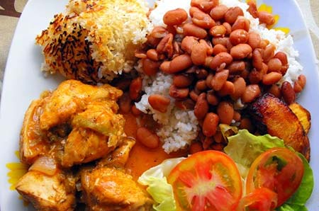 Lunch is the main meal of the day. The typical dish is the bandera dominicana or Dominican Flag: a heaping plate of rice and beans– with chicken or meat, a side salad with avocado, and tostones–crispy,