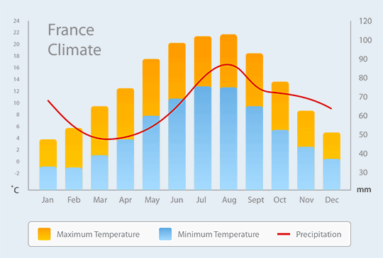 The climate of the Paris Basin is somewhere between the oceanic and the continental. The average yearly temperature is 53 °F (11 °C) in Paris.